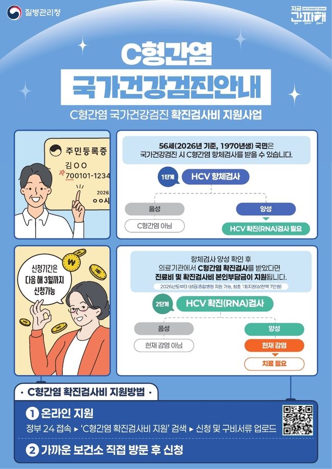 C형간염 확진 검사비 지원 홍보물.13일 구로구(구청장 장인홍)는 56세 구민을 대상으로 실시하는 ‘C형간염 확진 검사비 지원사업’의 적용 범위를 올해부터 종합병원을 포함한 전국 모든 의료기관으로 확대한다고 밝혔다. 이에 그동안 의원급 의료기관 이용자에게만 적용되던 지원이 병원 규모와 관계없이 가능해졌다.