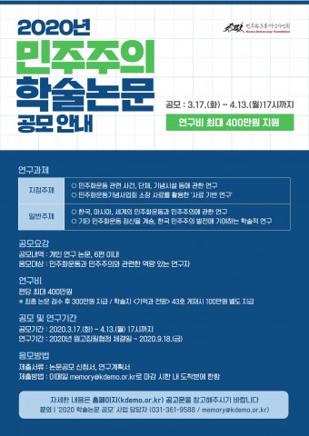 <2020년 민주주의 학술논문 공모>는 민주화운동과 민주주의 관련 학술 연구를 활성화하고자 진행되는 사업이다. 공모를 통해 선정된 논문 6편에게는 편당 최대 400만원의 연구비를 지급할 예정이다(·최종논문 검수 후 300만원 지급/ 사업회 발간 학술지 <기억과 전망> 43호 게재 시 100만원 추가 지급).