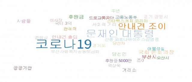 빅카인즈를 통해 4월 20일 기사를 분석하면 김예지, 국회법, 미래한국당, 코로나19, 문재인 대통령 등이 ‘장애인’ 기사와 연관성이 높은 단어로 나타났다. 키워드 빈도수 기준으로는 ‘코로나19’가 1위, ‘당선인’과 ‘조이’가 각각 2, 3위를 차지했다. 장애인 이슈와 관련해서는 장애인복지법, 장애등급제, 장애인차별금지법이 주요 연관키워드로 분석됐다.