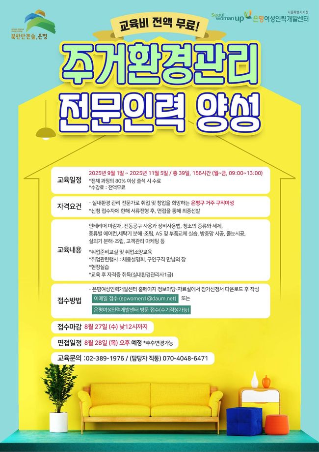교육은 오는 9월 1일부터 11월 5일까지 총 39일, 156시간에 걸쳐 은평여성인력개발센터에서 진행된다. 평일 오전 9시부터 오후 1시까지 운영되며, 수강료는 전액 무료다. 교육과정의 80% 이상 출석 시 수료가 인정되며, 수료 후에는 실내환경관리사 자격증 취득을 목표로 한다.