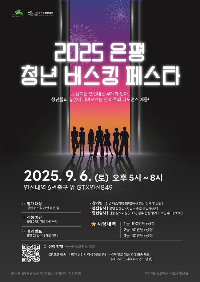 시상은 대상 100만 원, 우수상 50만 원, 장려상 30만 원 규모로 진행되며, 수상팀은 오는 9월 13일 개최되는 ‘은평 청년 축제’ 기념식 무대에 필수로 참여해 다시 공연을 선보일 예정이다.
